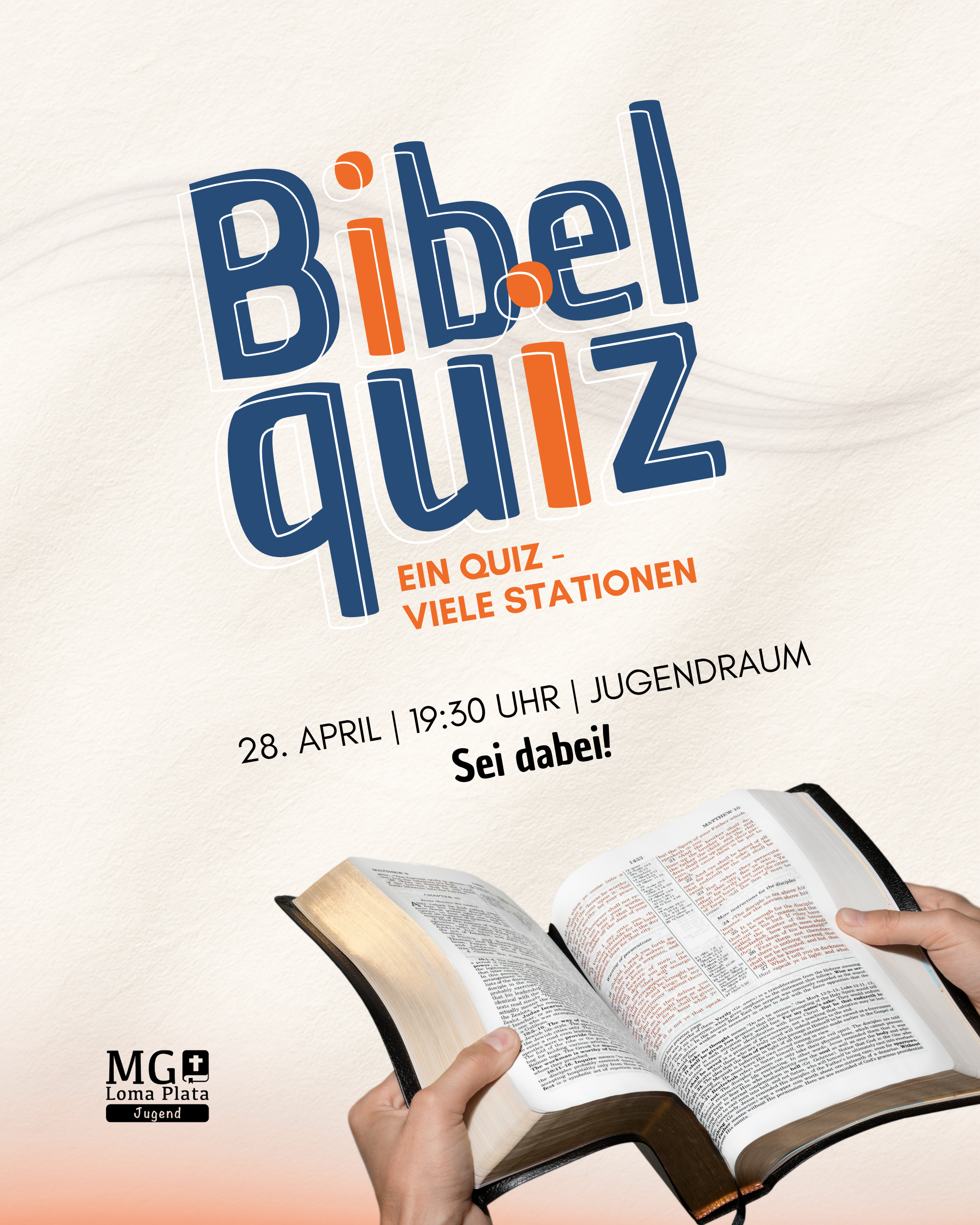 Frische dein Bibelwissen auf – Spaß ist garantiert! Herzliche Einladung zur Jugendstunde. Gemeinsam wollen wir spannende Fragen rund um die Bibel entdecken, unser Wissen testen, dazulernen und eine gute Zeit in Gemeinschaft verbringen. Egal, ob du viel weißt oder einfach neugierig bist – du bist herzlich willkommen!